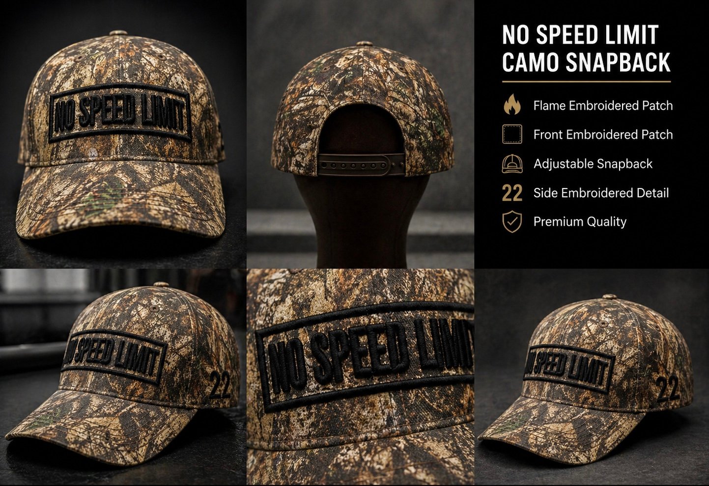 Where the streets end, the throttle doesn’t. The Backwoods Edition blends rugged camo with bold black embroidery for a low-key but aggressive look. Whether you're riding backroads, posted in the garage, or out in the wild, this hat keeps the “No Speed Limit” mindset alive anywhere you go.