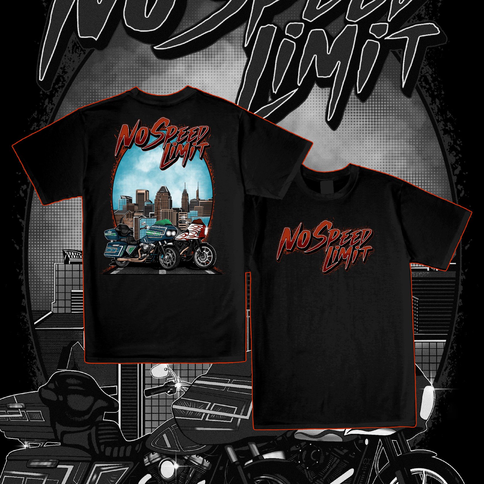 Built for riders who don’t believe in limits. The No Speed Limit: City Run tee brings together raw street energy and bagger culture, featuring a fully built performance bike ripping through a city skyline backdrop. Printed on a premium black tee with bold red lettering, this design hits hard whether you're on the highway or off the bike. Clean front hit, detailed full-back artwork—this is the one that gets noticed.